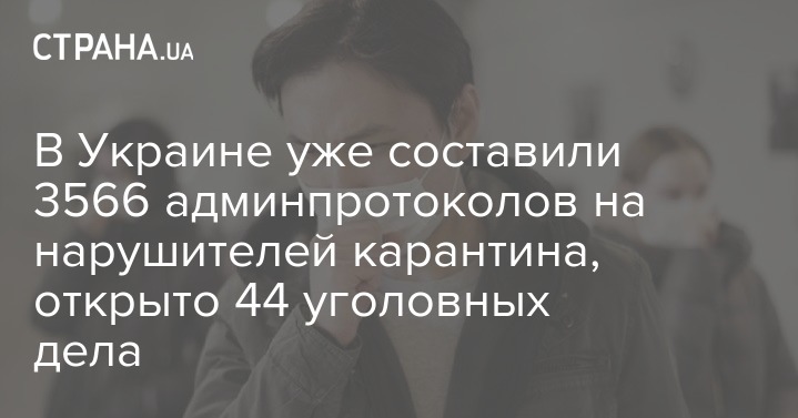 По состоянию на 3 апреля по фактам, связанным с нарушениями карантинных мер, было начато 44 уголовных производства. Только за нарушение режима самоизоляции с начала карантина было составлено 153 административных протокола: в Киеве - 64, Винницкой области - 18, Черновицкой - 17, Ивано-Франковской - 11, Полтавской - 8, Волынской - 5, Закарпатской - 5, Сумской - 4, Херсонской - 4, Хмельницкой - 4, Харьковской - 3, Киевской - 2, Кировоградской - 2, Николаевской - 1, Одесской - 1, Тернопольской - 1.