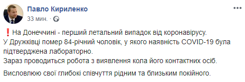 10:50 Первую смерть от коронавируса зафиксировали в Донецкой области. В Дружковке умер 84-летний мужчина. Об этом сообщил глава Донецкой ОГА Павел Кириленко
