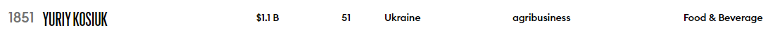 В рейтинге 2019 года Косюк занимал 1605 место и имел $1,4. Он делил эту строчку с Виктором Пинчуком. То есть за год он опустился в рейтинге на 246 позиций, а его состояние уменьшилось на $300 млн.