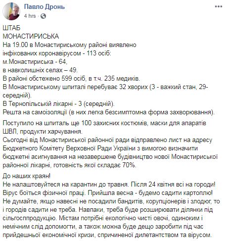 "По состоянию на 19:00 в Монастырисском районе обнаружено инфицированных коронавирусом - 113 человек: г.Монастыриска - 64, в окрестных селах – 49", - написал он на странице в Facebook.
