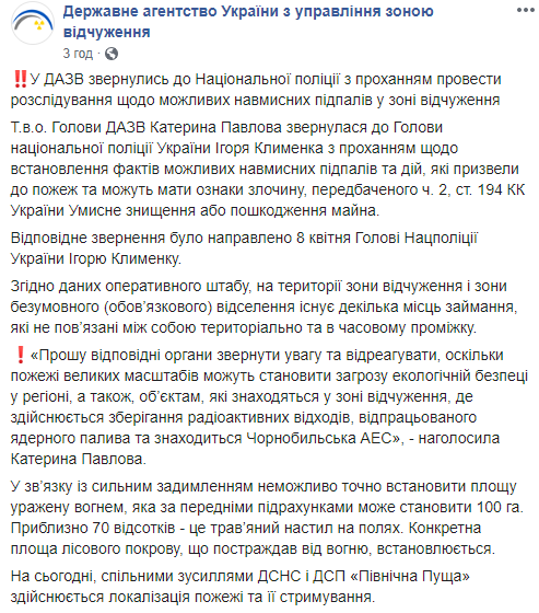 Государственное агентство Украины по управлению зоной отчуждения (ГАЗО) ️обратилось в полицию. Там подозревают, что пожары в зоне отчуждения могли случиться из-за преднамеренных поджогов в Чернобыле.