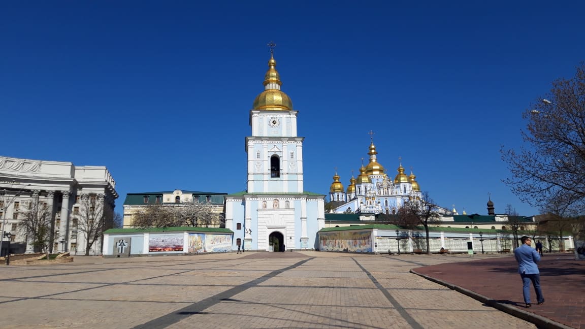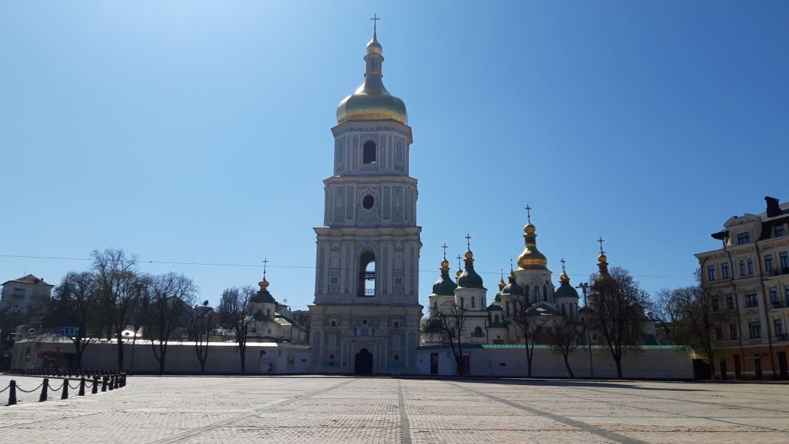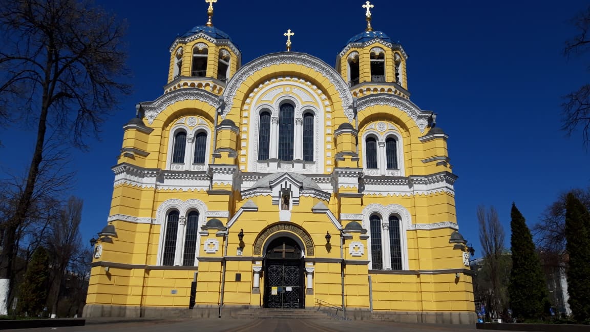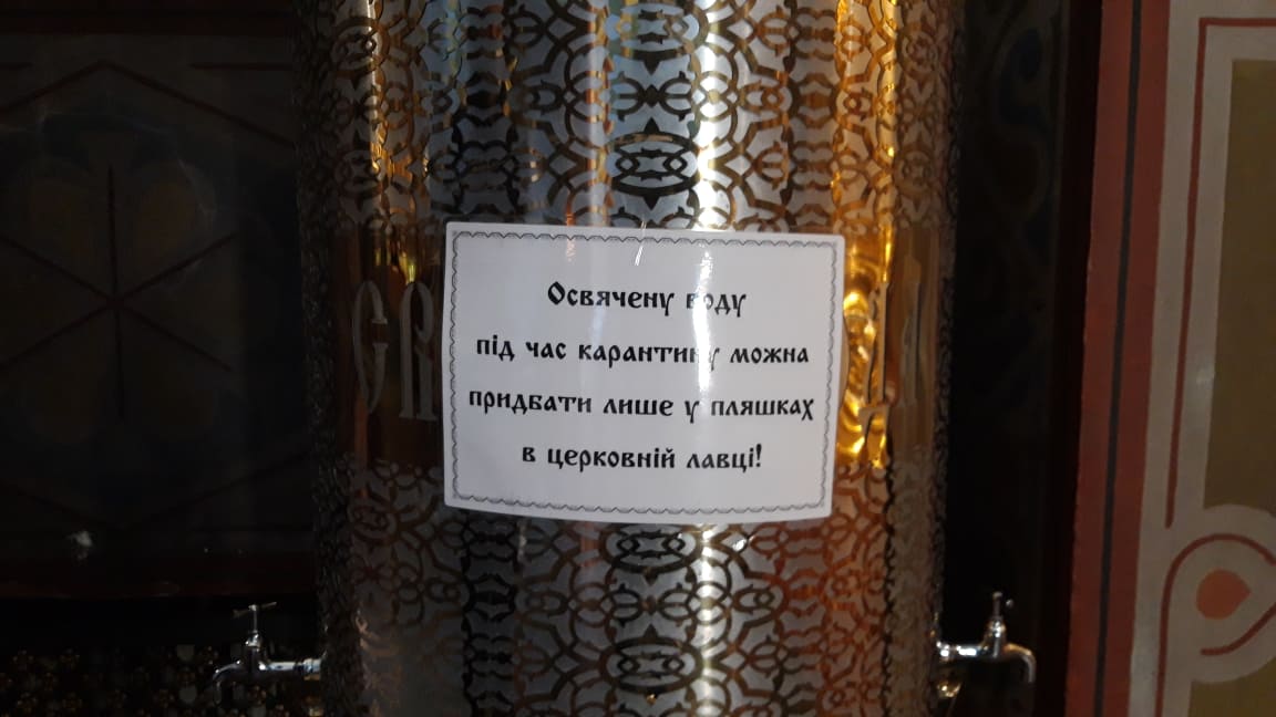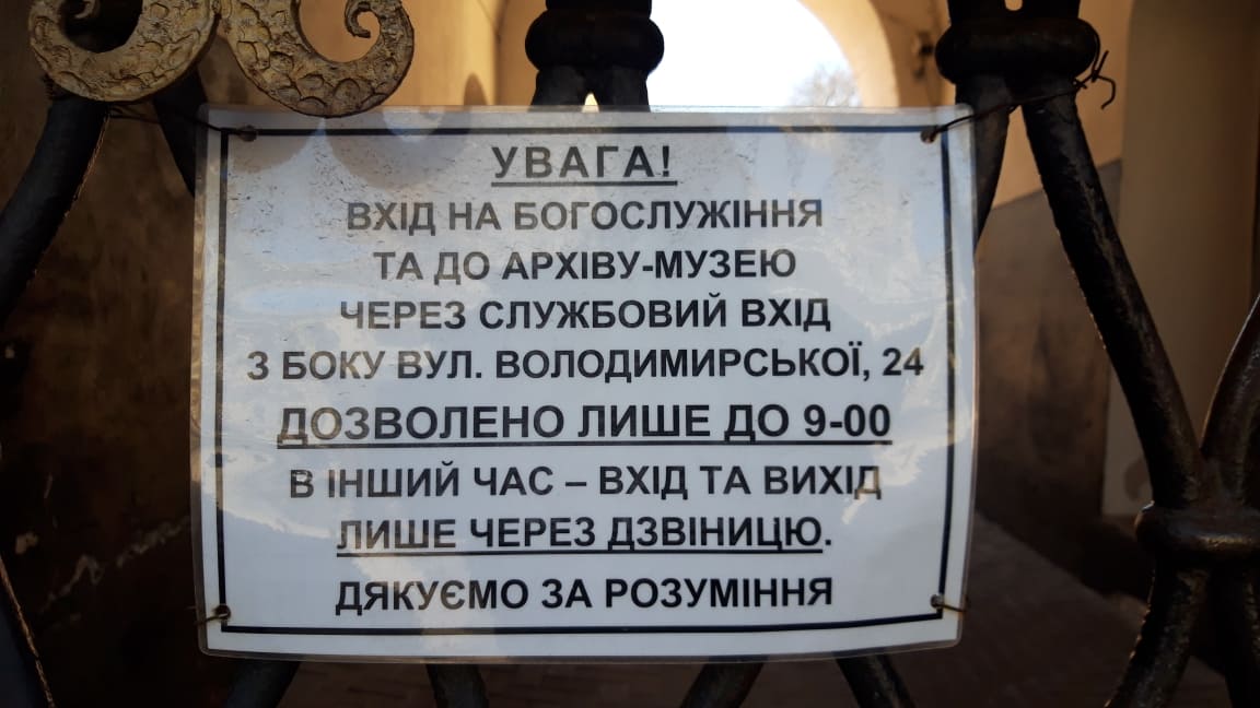 Владимирский собор в Киеве также работал в обычном режиме. Перед входом было предупреждение, что расстояние между посетителями должно быть не менее двух метров, а также нужно надеть защитную маску. Стоял столик с флаконом антисептика, правда, само средство закончилось.