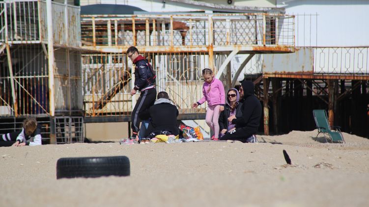 Одесситы отдыхают на пляже возле 411-й батареи. Несмотря на холодный ветер и на то, что дорога к пляжу здесь не слишком удобная, у моря достаточно много людей.