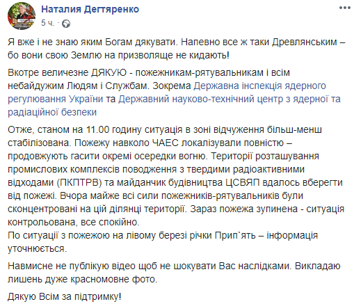 "Прекратите наконец-то врать! Что вы якобы контролируете ситуацию. О каком "горении травяного настила, камыша и лесной подстилки отдельными очагами" вы твердите?! Сейчас ситуация неконтролируемая - она критична. От всего сердца спасибо пожарным и спасателям! Спасибо так же, как в 1986 году!" — написала Дегтяренко в Facebook.