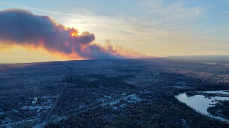 Масштабный лесной пожар в Чернобыльской зоне отчуждения сняли с высоты птичьего полета.