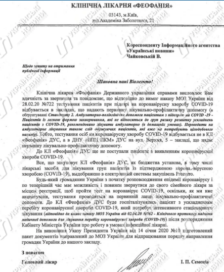 "Тестирование пациентов при подозрении на коронавирусную болезнь COVID-19 происходит в учреждениях, которые предоставляют первичную лечебно-профилактическую помощь. То есть, тестирование лиц на коронавирусную болезнь COVID-19 происходит не в клинической больнице "Феофания" Государственного управления делами, а в государственном научном учреждении "Научно-практический центр профилактической и клинической медицины" ГУД", - сказано в нем.