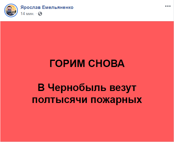 "Горим снова. В Чернобыль везут полтысячи пожарных", написал Емельяненко в Facebook.