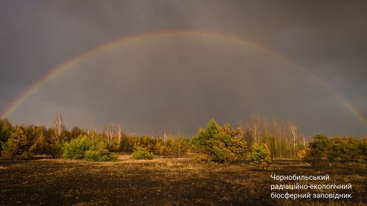 В сети появился снимок радуги над сгоревшими территориями Чернобыльского заповедника. Фото: Facebook / Чернобыльский Радиационно-экологический Биосферный Заповедник