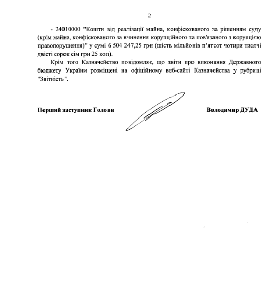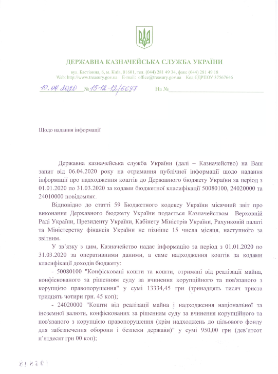 Так, по информации казначейства, от реализации имущества и поступления национальной и иностранной валюты, конфискованных по решению суда за совершение коррупционного и связанного с коррупцией правонарушения в госбюджет поступило 950 грн. При этом сумма конфискованных средств и средств, полученных от реализации конфискованного за такие преступления имущества, составляет 13,3 тысяч гривен.