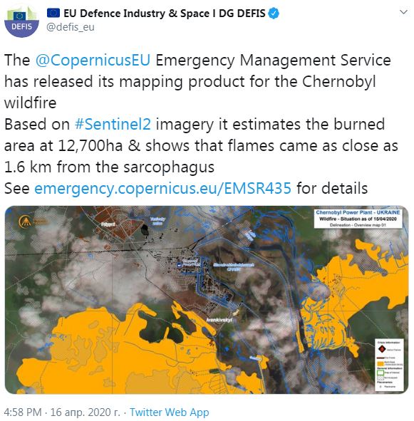 "Основываясь на снимках Sentinel2, сожженная площадь оценивается в 12 700 га и показывает, что пламя было на расстоянии всего 1,6 км от саркофага", - сказано в нем.