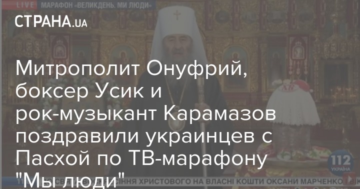 В телевизионном марафоне "Мы люди" украинцев поздравили с Пасхой Предстоятель УПЦ Блаженнейший митрополит Онуфрий, митрополит Антоний, боксер Александр Усик, а также известный рок-музыкант Олег Карамазов и другие.