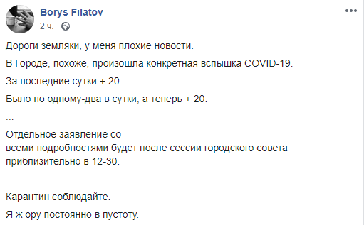 08:48 Мэр Днепра Борис Филатов сообщил о вспышке коронавируса за последние сутки. Подтвердили сразу 20 случаев, хотя до этого фиксировали 1-2 в сутки.