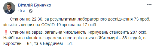 09:12 Губернатор Житомирской области Виталий Бунечко опубликовал статистику на вечер 21 апреля (до 22:00 области передают данные в Минздрав для утренней статистики следующего дня - Ред.). За сутки 17 новых случаев. Общее количество в области - 287.