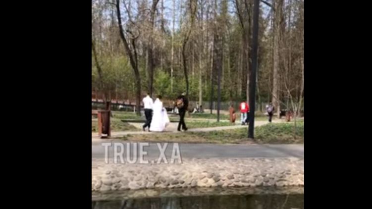 Например, на одном видео (судя по всему, снятом в балке Саржин яр, где любят проводить время харьковчане), новобрачные куда-то спешат.  Скорее  всего, на фотосъемку.