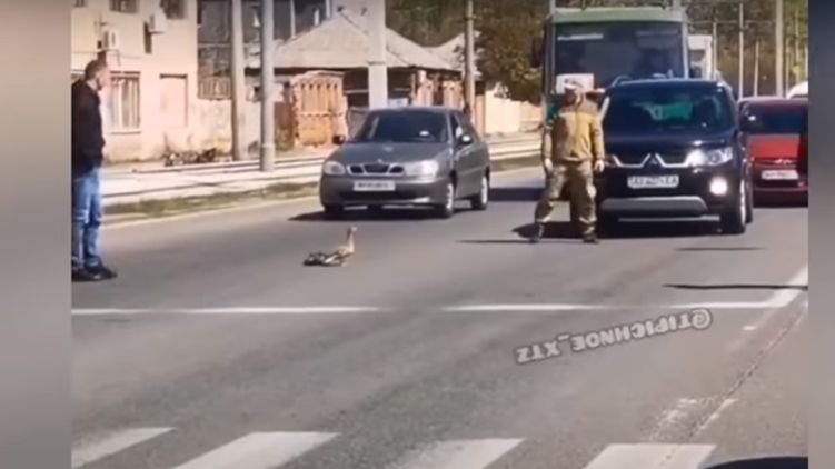В Харькове дикая утка с утятами заблокировала движение на одной из оживленных улиц. Видео