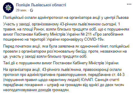 "Участие в организованном 43-летним львовянином мероприятии на пл. Рынок приняли около тридцати человек, что является нарушением требований постановления Кабмина. Перед началом акции, которая была заявлена ​​как одиночный пикет, полицейские провели с организатором разъяснительную беседу, однако, несмотря на это, в мероприятии приняли участие около тридцати человек", - говорится в сообщении.
