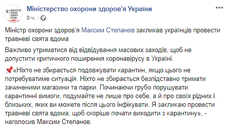 Глава Минздрава Максим Степанов призвал украинцев воздержаться от посещения массовых мероприятий и провести майские праздники дома, чтобы не допустить критического распространения коронавируса в стране.