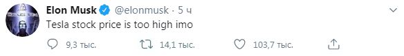 "Стоимость акций Tesla слишком высока, имхо", - написал Маск.