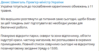 12:31 Сегодня в 13:00 на заседании Кабмина рассмотрят меры снятия карантина после 11 мая. "чтобы бизнес успел подготовиться".