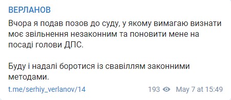 "Среди требований иска - признать противоправным и отменить распоряжение правительства от 24 апреля 2020 года №452-р, которым Сергей Верланов был уволен с должности главы Государственной налоговой службы Украины, и восстановить его в указанной должности", - сообщила пресс-служба на сайте суда.