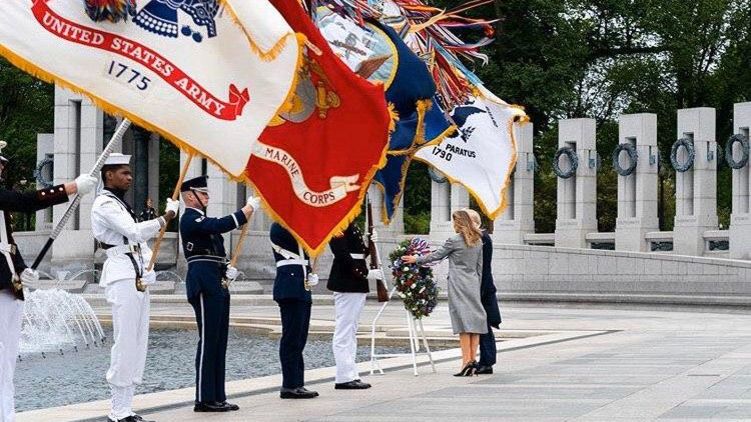 Дональд и Мелания Трамп в стильных образах возложили венки к мемориалу Второй мировой. Фото