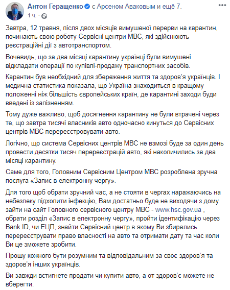 "Вы всегда успеете продать или купить авто, а вот здоровье можете не уберечь. Поэтому пожалуйста, прочитайте внимательно инструкцию по пользованию услугой "Запись в электронную очередь" на сайте ГСЦ МВД и зарегистрируйтесь для того чтобы не тратить свое время в очередях, не рисковать здоровьем и получить услуги в комфортных условиях", - сказал Геращенко.