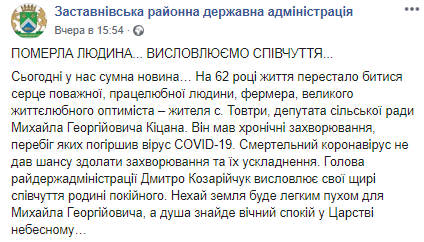 "На 62 году жизни перестало биться сердце уважаемого, трудолюбивого человека, фермера, большого жизнелюбивого оптимиста - жителя села Товтры, депутата сельского совета Михаила Георгиевича Кицана. Он имел хронические заболевания, течение которых ухудшил вирус COVID-19. Смертельный коронавирус не дал шанса преодолеть заболевание и его осложнения ", - говорится в сообщении.
