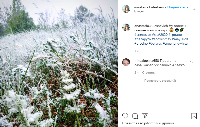 "Ну очень свежее майское утро", - пишет пользователь Инстаграм Анастасия Кулешевич и публикует фото укрытой снегом травы.