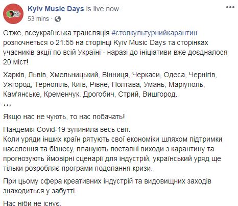 Акция призвана показать властям недовольство работников индустрии действиями Кабмина, который до сих пор не подготовил план по выходу украинской культурной сферы из карантина.