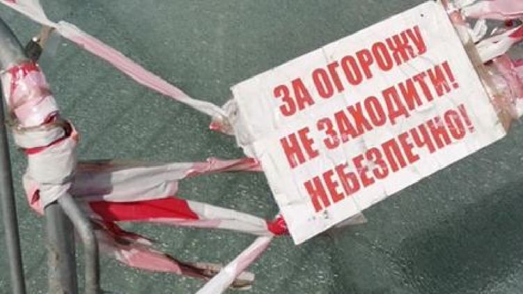 На снимке видно, что одно из стекол на мосту снова повреждено. Вокруг него ограждения и красно-белые ленты. Также вывешено объявление: "За ограждение не заходить! Опасно!".