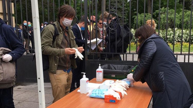 Журналистам выдают перчатки на входе на территорию Мариинского дворца. Фото: "Страна"