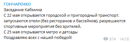14:22 Тем временем нардеп Алексей Гончаренко пишет: "С 22 мая открывается городской и пригородный транспорт, запускаются отели (без ресторанов и бассейнов), разрешаются спортивные мероприятия без зрителей. С 25 мая открывается метро и детсады".