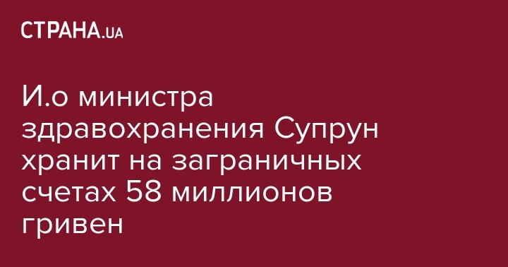 Исполняющая обязанности министра здравоохранения Ульяна Супрун по итогам 2015 года получила чуть более 129,6 тыс грн, и еще у нее 58,1 млн грн находится на счетах за границей. Такие данные указаны в ее декларации, опубликованной на сайте Министерства здравоохранения.