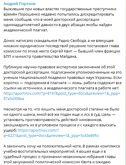 Портнов опубликовал научно-правовое экспертное заключение о диссертации, подписанное ученым Национальной Академии правовых наук Украины. В заключении сказано, что подозрения в плагиате - ложь, научная работа содержит все ссылки на источники, а академического плагиата в работе нет.
