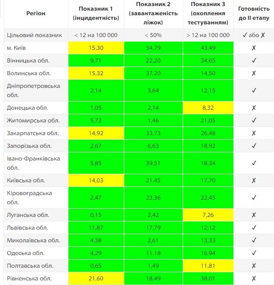 Минздрав опубликовал таблицу выполнения условий адаптивного карантина по областям страны, которая говорит о готовности к переходу на второй этап ослабления карантина. Данные будут ежедневно обновляться, чтобы каждый украинец видел, сколько осталось до конца ограничений в его регионе или городе.