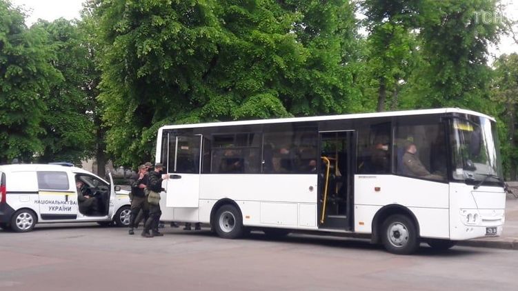 Возле здания суда находится много полиции, за ним - автобус с нацгвардейцами.