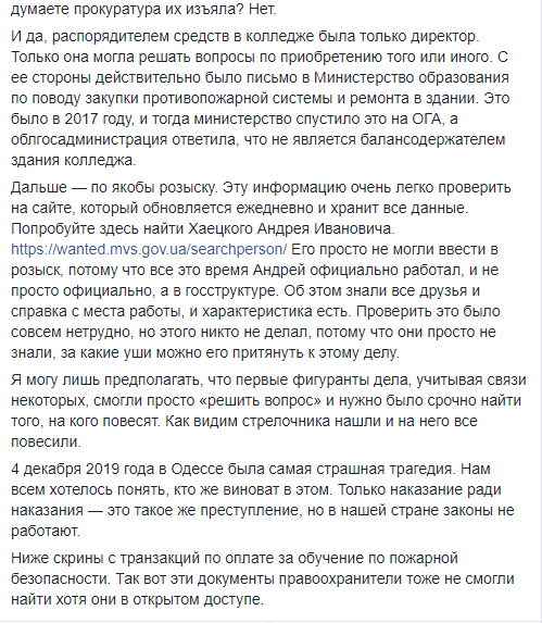 В Одессе - новый поворот в деле о смертельном пожаре в колледже, который произошел 4 декабря и унес жизни 16 человек. Суд заключил под стражу известного местного поэта Андрея Хаецкого, который ранее был заместителем директора сгоревшего учебного заведения по административно-хозяйственной работе, но уволился по состоянию здоровья (перенес операцию на сердце) 18 ноября - еще до трагических событий.
