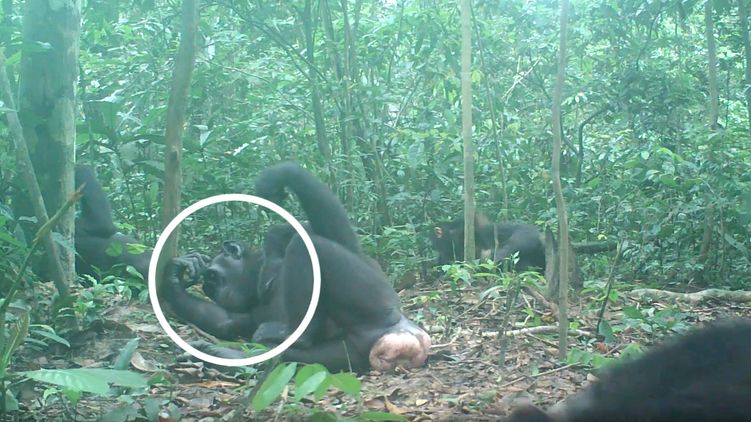 Шимпанзе выуживает термита лежа. Скриншот из видео
