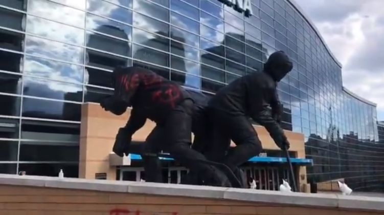 В городе Питтсбург американского штата Пенсильвания, где сейчас проходят протесты против полицейского насилия, неизвестные раскрасили статую канадского хоккеиста Марио Лемье. Теперь поверх нее нанесен красный серп и молот.