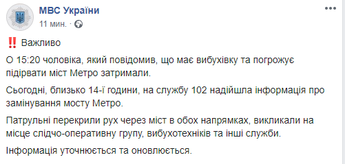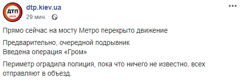 14:30 "Прямо сейчас на мосту Метро перекрыто движение. Предварительно, очередной подрывник. Введена операция "Гром". Периметр оградила полиция, пока что ничего не известно, всех отправляют в объезд" - сообщает dtp.kiev.ua в Facebook.