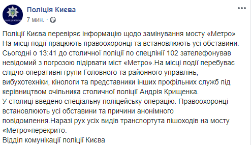 "Сегодня в 13:41 в столичную полиции по спецлинии 102 позвонил неизвестный с угрозой взорвать мост "Метро". На месте происшествия находится следственно-оперативные группы, взрывотехники, кинологи и представители других профильных служб. В столице введена специальная полицейская операция. Движение всех видов транспорта перекрыто" - говорится в сообщении.