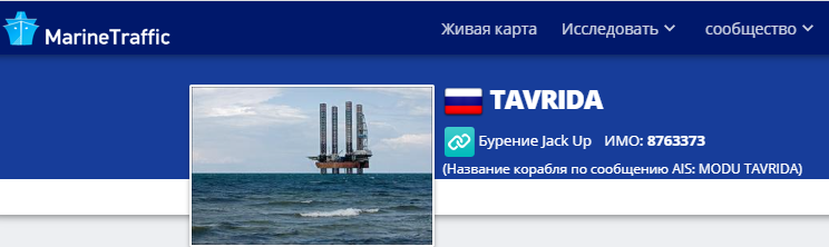 В международной базе судов украинскую буровую вышку "Таврида" пометили российским флагом