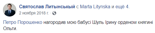 В следующем году его бабушку, педагога Ирину Шуль, наградил Петр Порошенко.