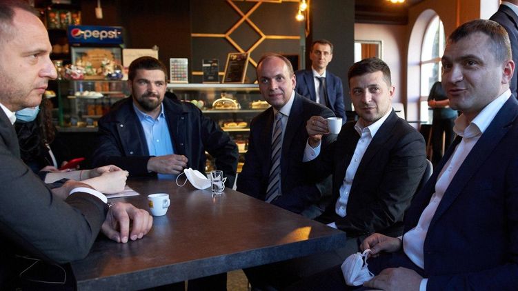 За столиком сидят сразу шесть человек. Вместе с Владимиром Зеленским, глава Офиса президента Андрей Ермак и пресс-секретарь президента Юлия Мендель. Позади них стоит главный санитарный врач Украины Виктор Ляшко. Все, кроме Юлии Мендель, находятся в заведении без защитных масок, что является нарушением правил карантина.