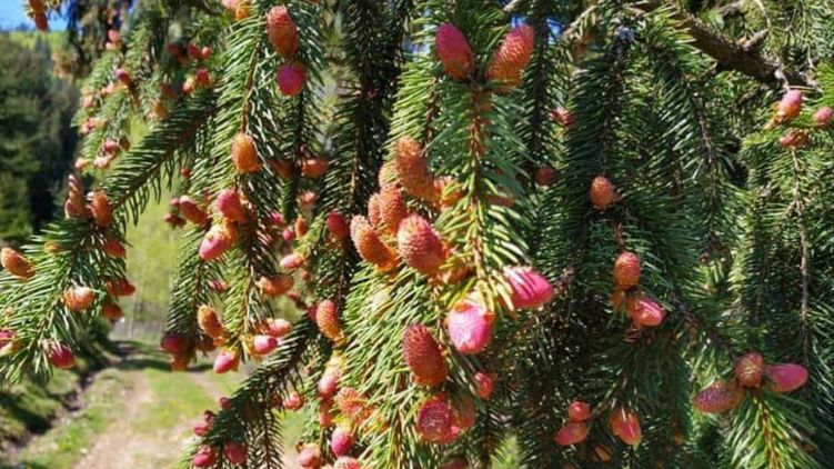 "Мужские шишечки удлиненно-цилиндрические (20-25 мм длиной), красноватые, размещенные на концах прошлогодних побегов. Женские шишечки зеленоватые или малиновые (10-15 мм длиной), цилиндрические, размещенные на концах молодых веточек. Спелые шишки продолговато-цилиндрические (10-15 см длиной), сначала зеленые или фиолетовые, позже бурые, повисшие, блестящие. А еще гуцулы говорят: "Что если ель так хорошо цветет, то будет урожай на грибы", - сообщили в лесхозе.