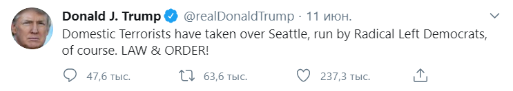 "Внутренние террористы захватили Сиэтл, управляемый радикально-левыми демократами, конечно. Закон и порядок!", – говорится в публикации президента.