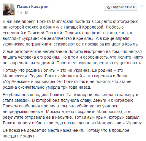 Топ-темой Павла Казарина стала критика России за ее политику в Украине и, в частности, по Крыму. "Электроблокада Крыма — не месть, а инструмент", - защищал отключение света своей малой родине журналист.