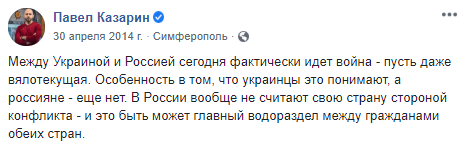 "Между Украиной и Россией сегодня фактически идет война - пусть даже вялотекущая. Особенность в том, что украинцы это понимают, а россияне - еще нет. В России вообще не считают свою страну стороной конфликта - и это, быть может, главный водораздел между гражданами обеих стран", - написал он 30 апреля 2014 года.