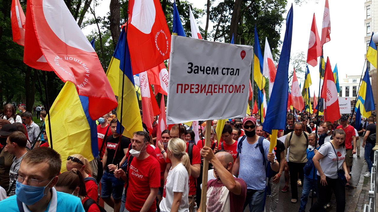 12:50 Сторонники "Партии Шария" возле дома Зеленского по адресу Грушевского, 9а. Они скандируют: "Вова, выходи". Митингующие также кричат: "Страна не Квартал и нам не смешно", "Закон один для всех", "Верни наши голоса".