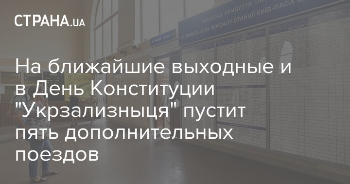 "Укрзализныця" назначила пять региональных поездов для дополнительных перевозок пассажиров. Они будут курсировать в периоды с 19 по 21 июня, а также с 26 по 29 июня - накануне и после Дня Конституции Украины.